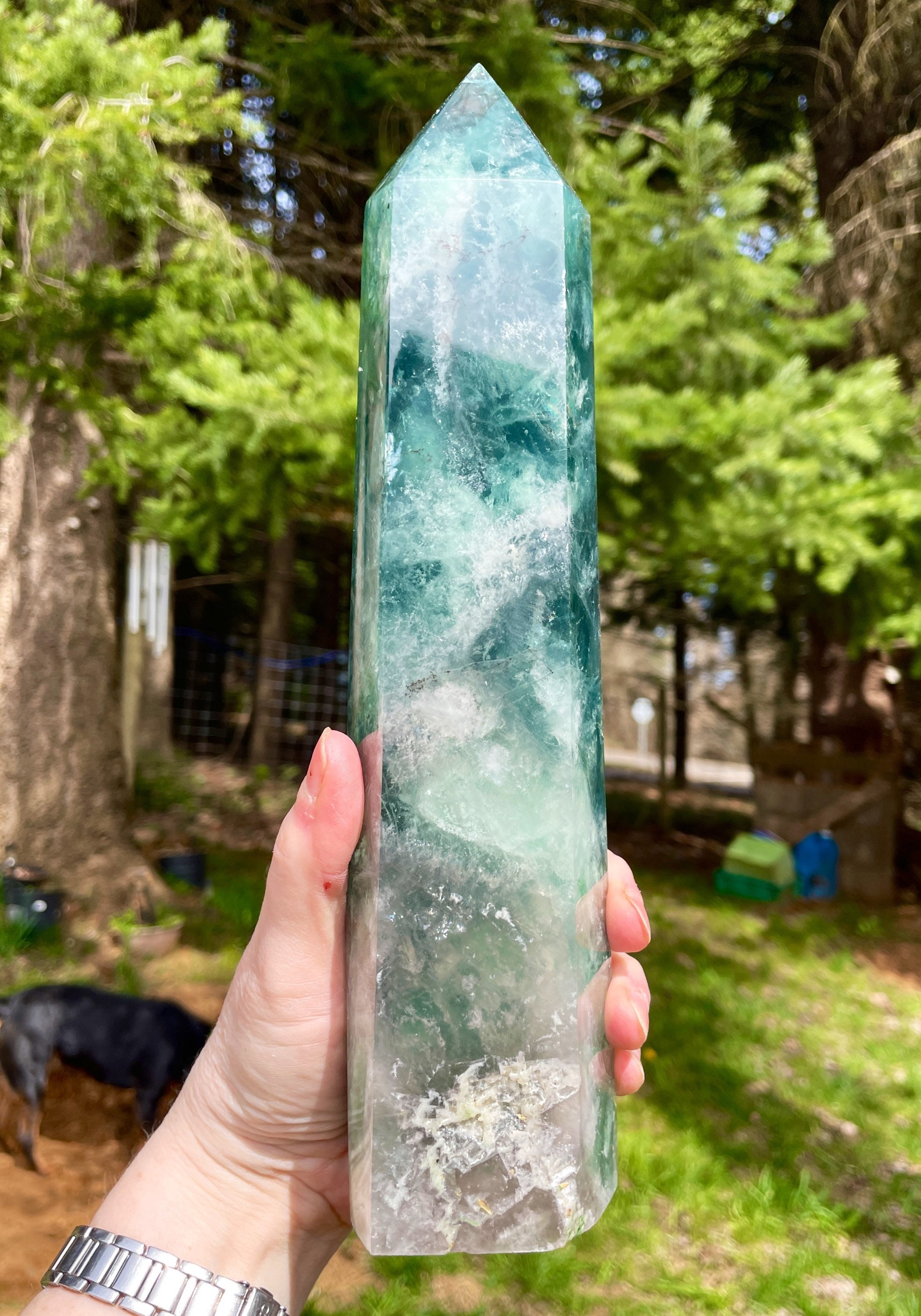 Large green, white and gray Rainbow Fluorite obelisk pillar tower point wand column generator mineral display specimen with rainbows.