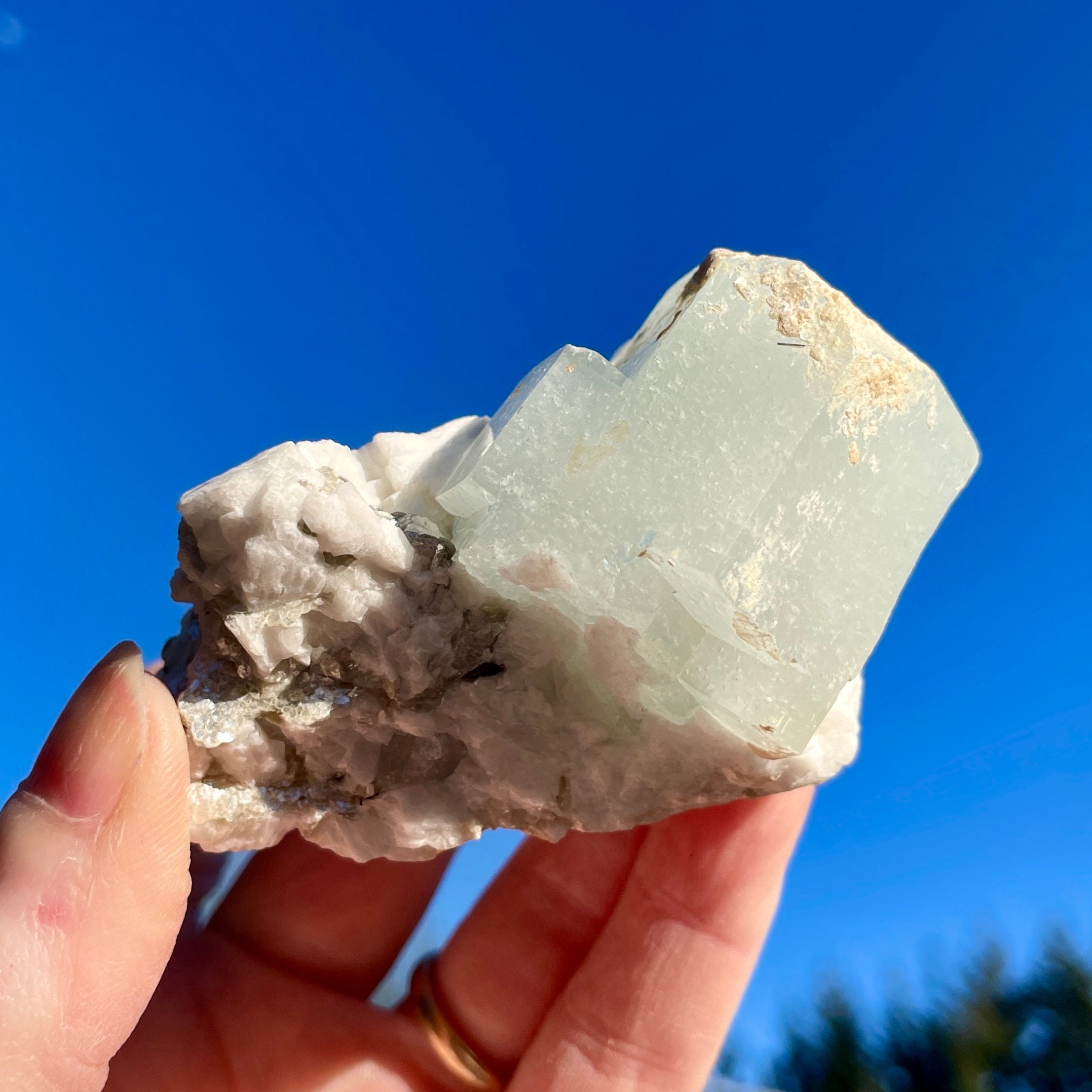 Very large, stepped, terminated Aquamarine crystal with Mica on a Feldspar matrix specimen for collectors of gems and minerals.