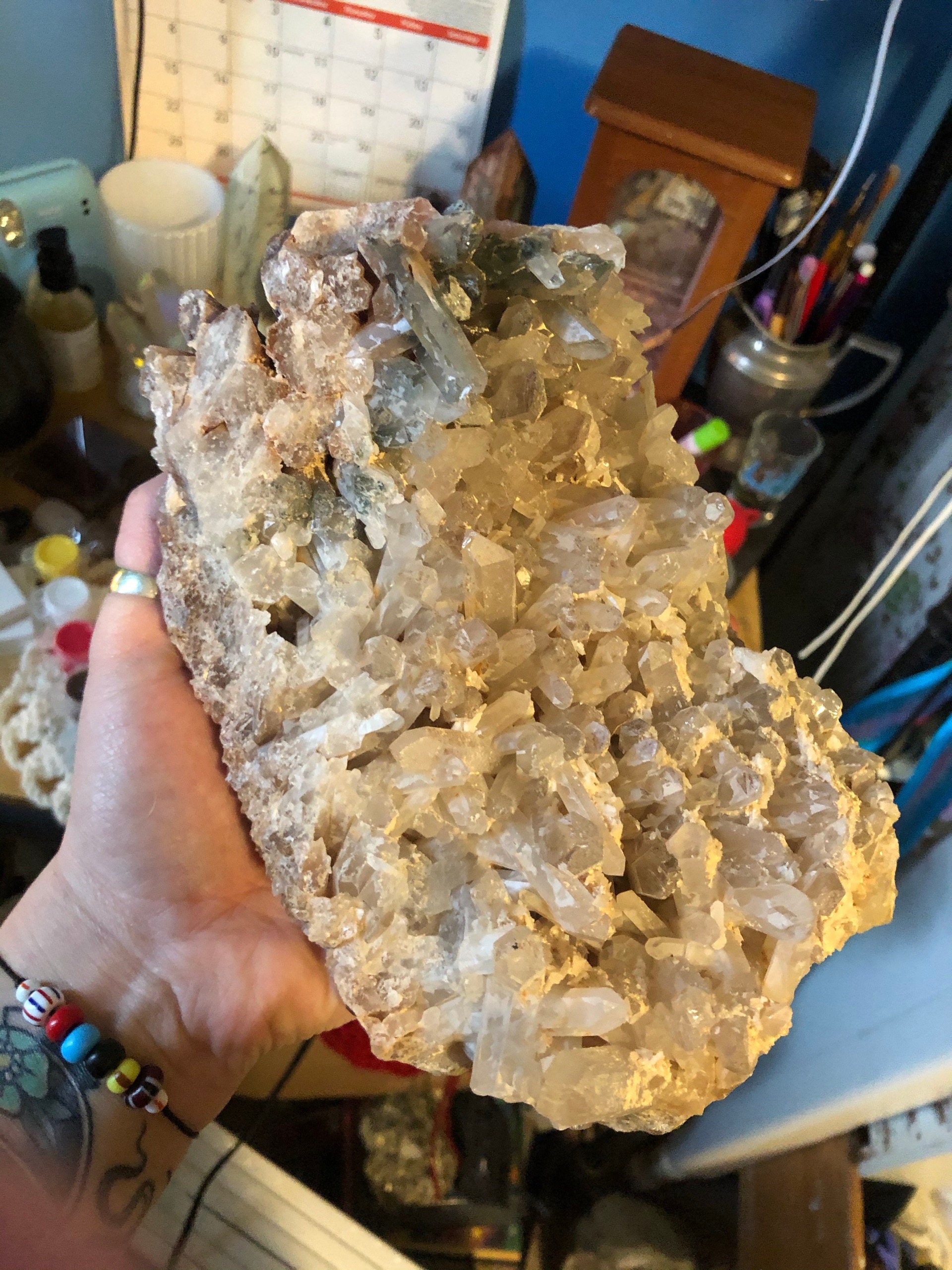 This is a really big Quartz crystal cluster that has green Chloride inclusions in some of the Quartz crystals on one end along with some reddish brown Calcite and some small, white Calcite crystals also. this crystal specimen is large, heavy and really unique!