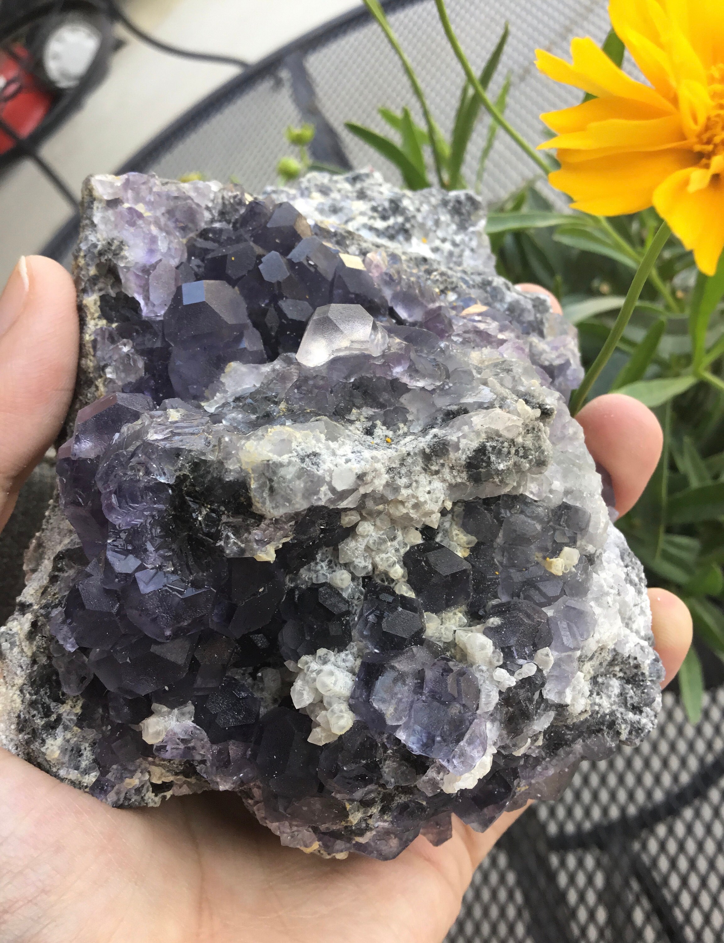 Stunning purple violet octagonal Fluorite crystals and white Quartz crystals make up this gorgeous crystal cluster that has amazing energy!